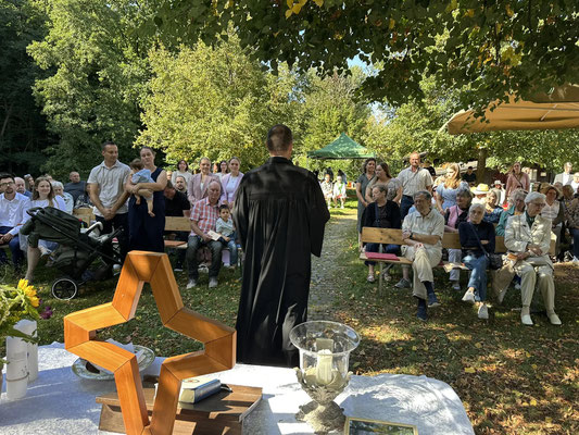 Am 7.9.25 fand in der Aggeraue eine Premiere statt. Zum ersten Mal wurden Täuflinge der Emmausgemeinde in der Agger mit Aggerwasser getauft. Fünf Taufen fanden bei bestem Wetter während des Gottesdienst statt. Etliche Besucher nutzten die Möglichkeit der Tauferinnerung und erhielten einen Segen.